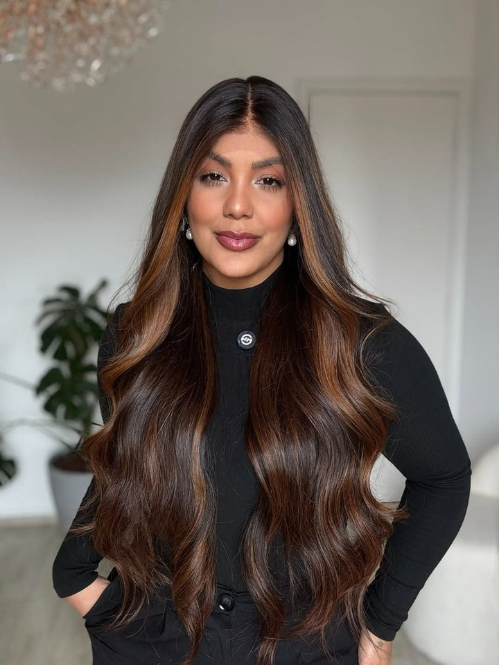 • Hazel Highlights: Dark brown strands are enhanced with warm, macchiato shades and brightened with hazel-tinted highlights, creating a multi-dimensional, natural look.