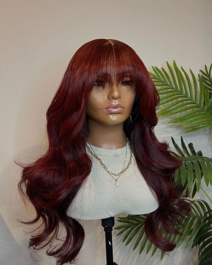 Whether you're looking to enhance your everyday style or make a memorable impression at special events, this Bright Red Wavy Wig with Blunt Cut Bangs is the ideal choice for showcasing your unique personality and sense of style.